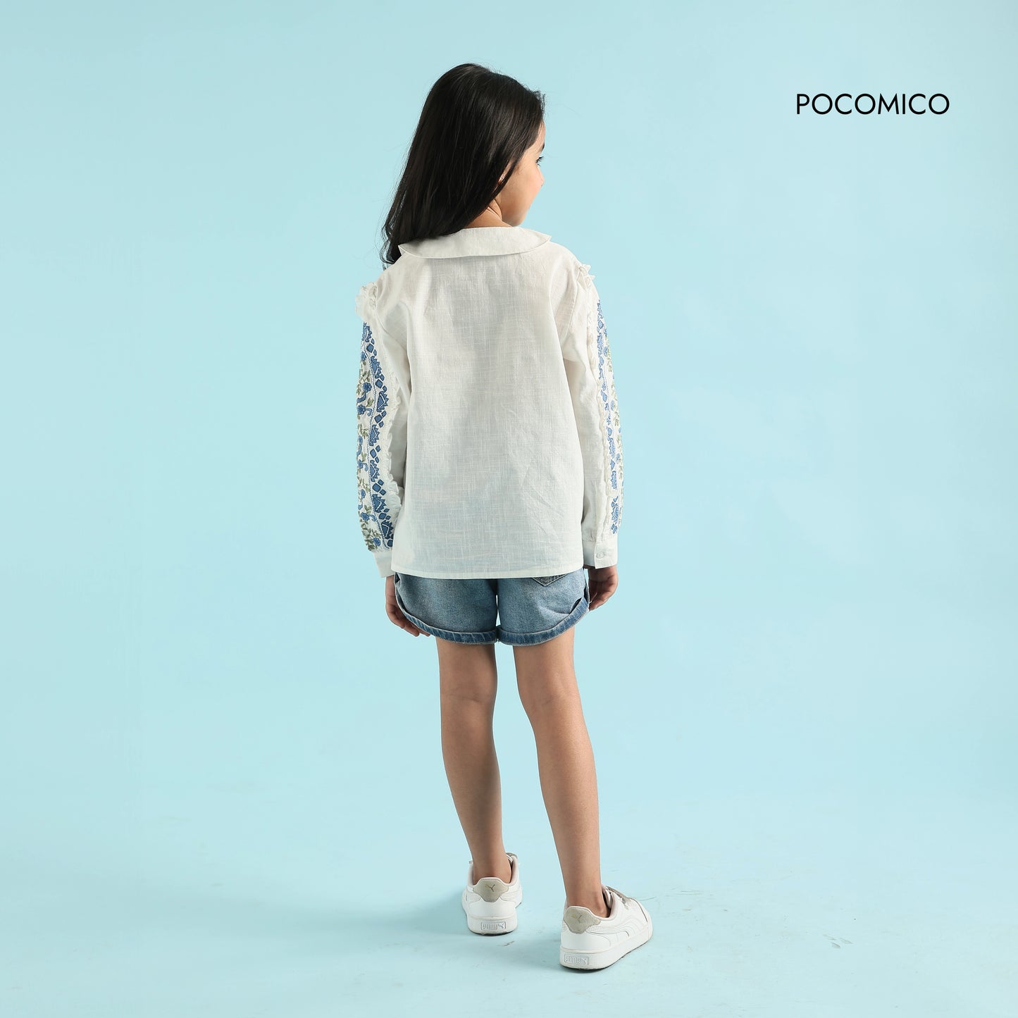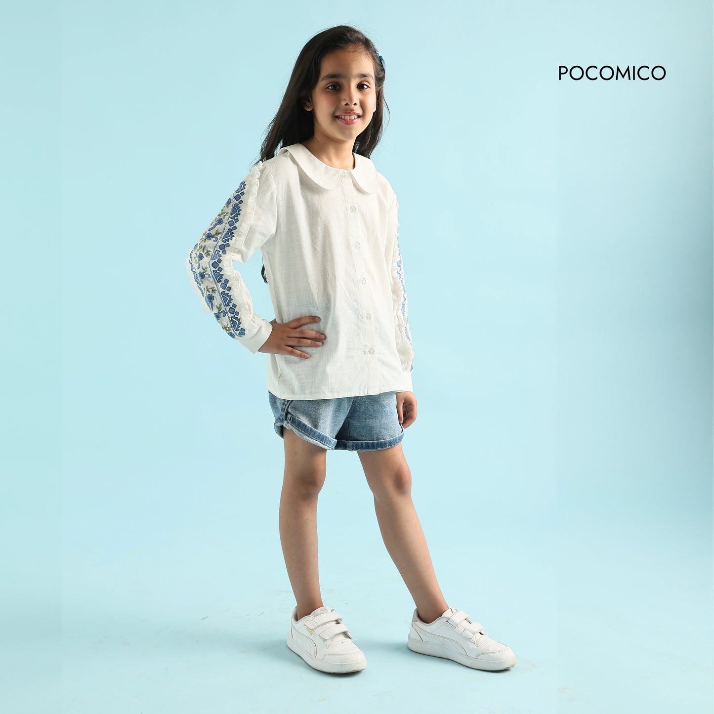 Timeless yet playful, the Bloom Embroidered Shirt is the perfect blend of charm and comfort. Made from 100% BCI cotton slub, this crisp white shirt features delicate blue floral embroidery, adding a touch of sophistication to any outfit. Whether paired with jeans for a casual look or a skirt for a polished ensemble, this shirt is made for little fashionistas who love effortless grace.