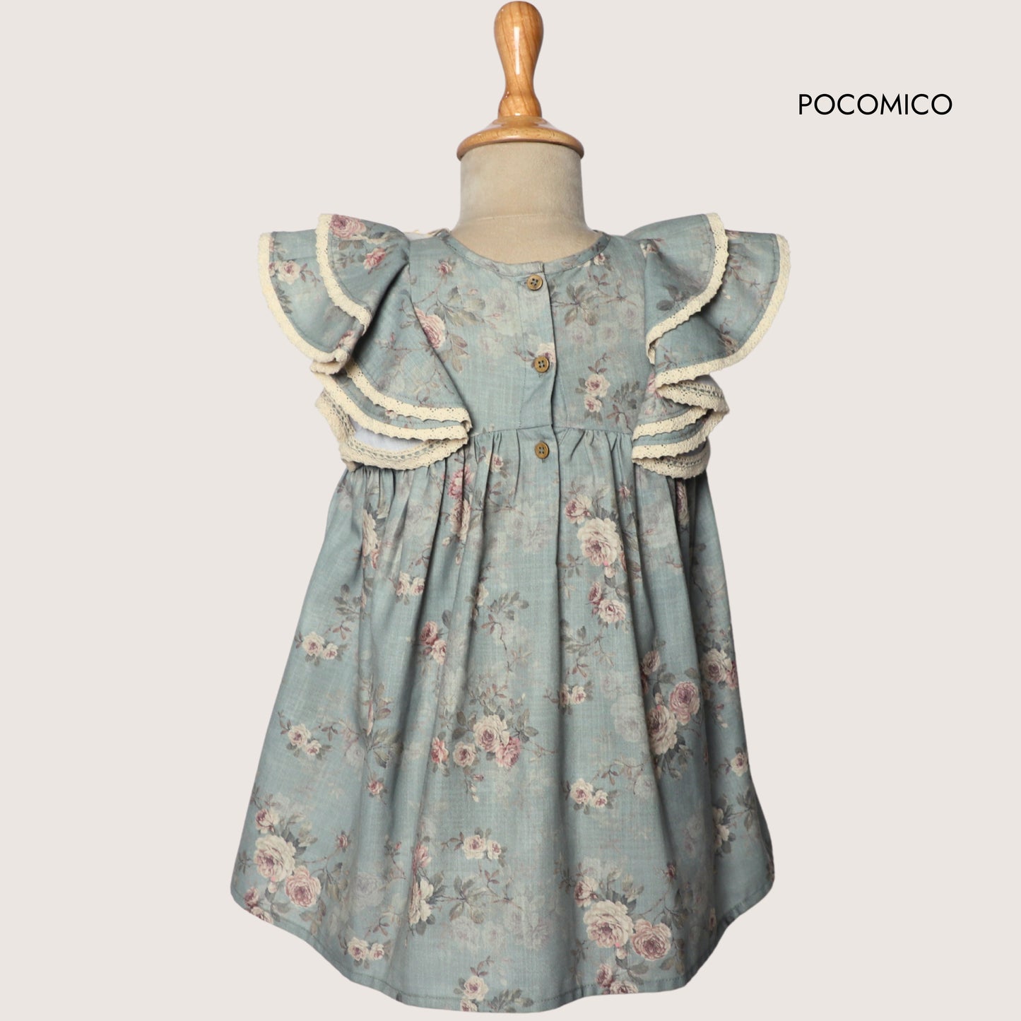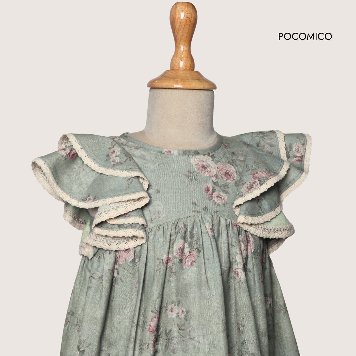 The delicate pastel green background is adorned with a soft, vintage floral design, while the ruffled, puffed sleeves feature fine lace detailing adding a touch of timeless elegance. The flowing, gathered skirt ensures comfort and grace in every twirl, making this an absolute favorite for any occasion.