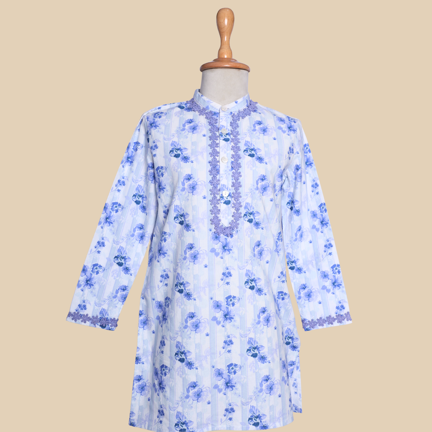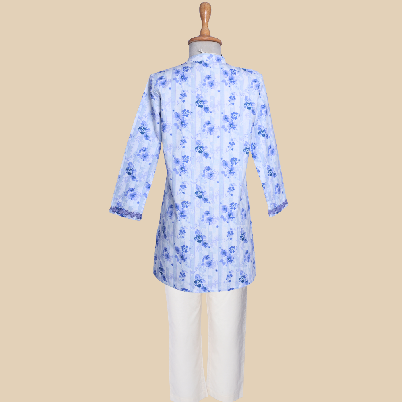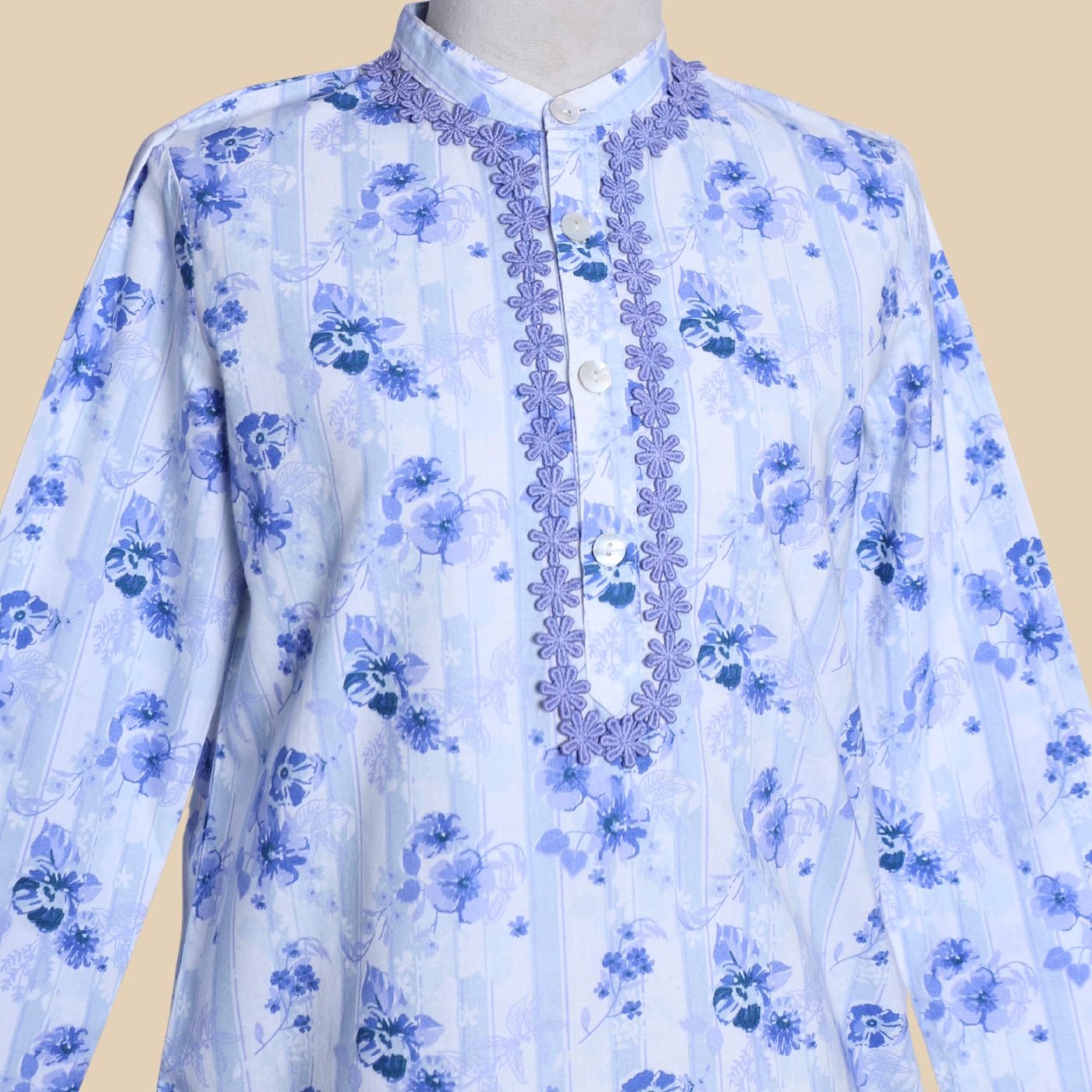 The Arin Bloom Kurta Set feels gentle, fresh, and perfect for warm-weather dressing. Crafted from 100% BCI-certified cotton, it offers a breathable and comfortable fit for long hours of wear. The soft blue floral print gives the kurta a calm, spring-like feel, while the simple silhouette keeps the outfit easy to wear. Paired with a clean bottom, this set works beautifully for daytime festive events, family functions, and relaxed summer celebrations.