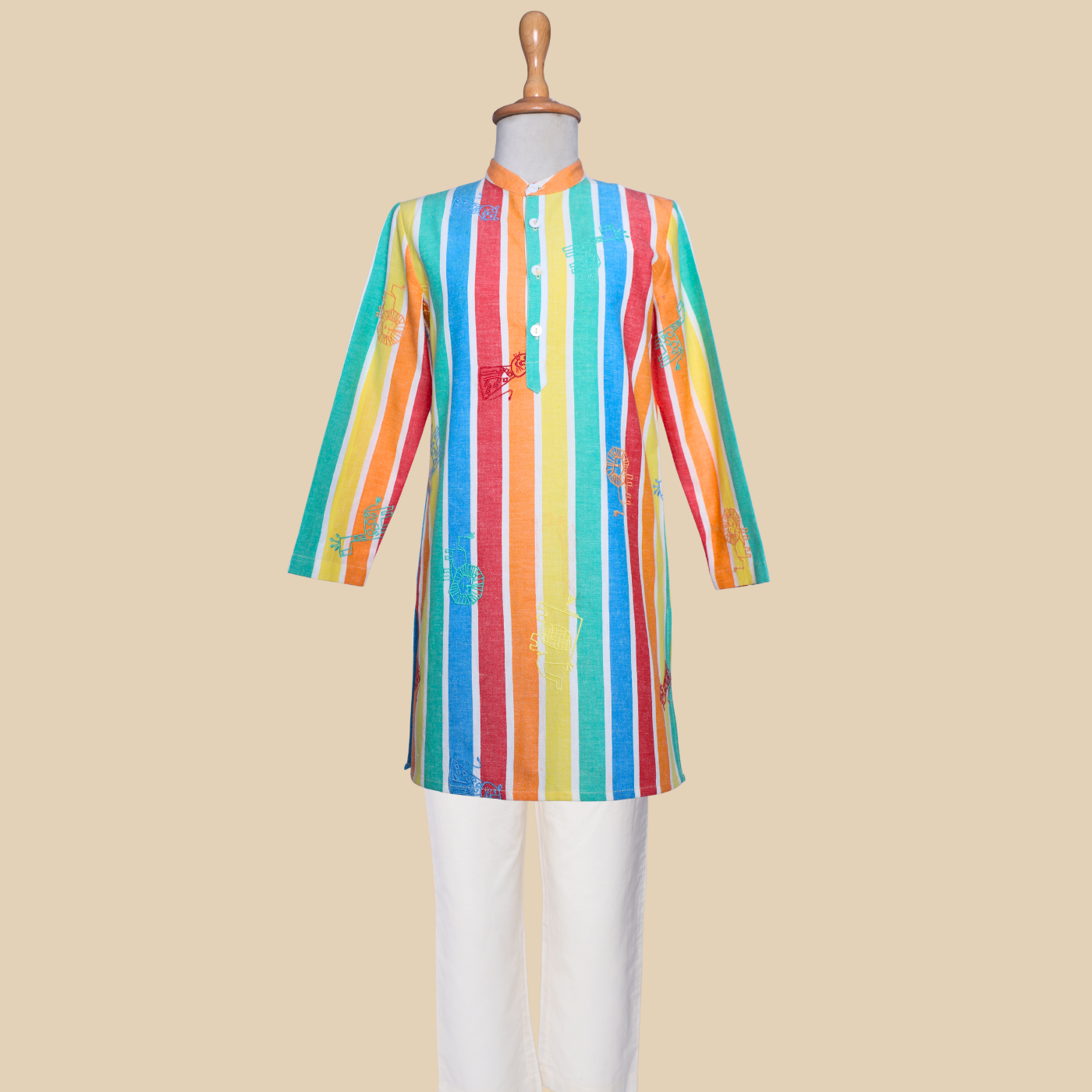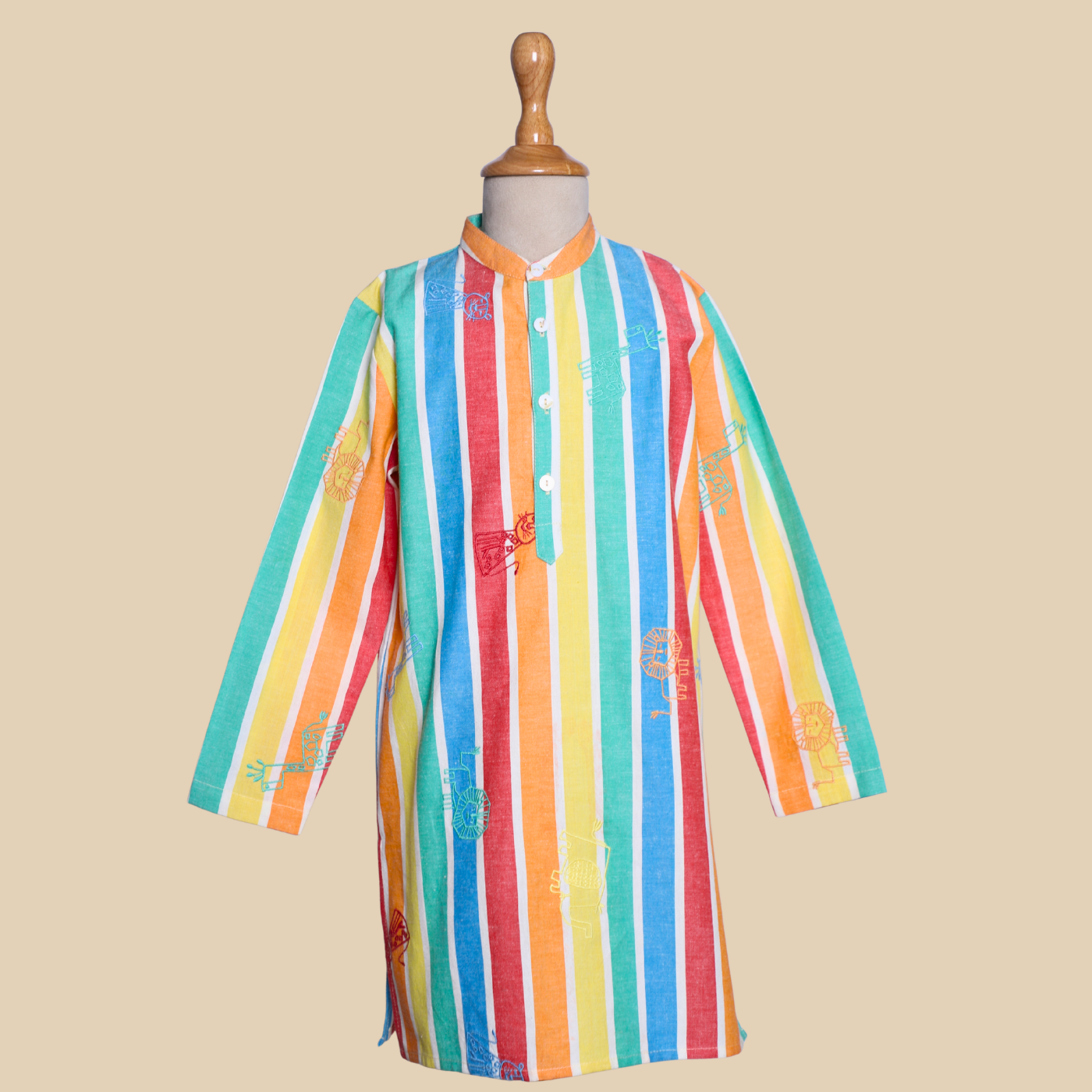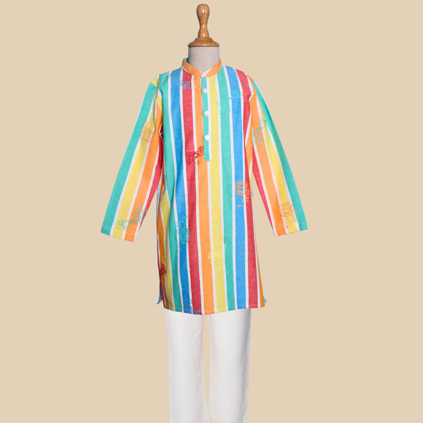 The Rang Lehar Kurta Set is a smart and cheerful choice for boys who enjoy something a little different. Made from 100% BCI-certified cotton, it feels light, soft, and comfortable all day long. The vertical multicolour stripes add energy and freshness to the look, while the straight kurta shape keeps it neat and wearable. Paired with a simple bottom, this set is ideal for summer celebrations, family gatherings, or any occasion where comfort and style should go hand in hand.