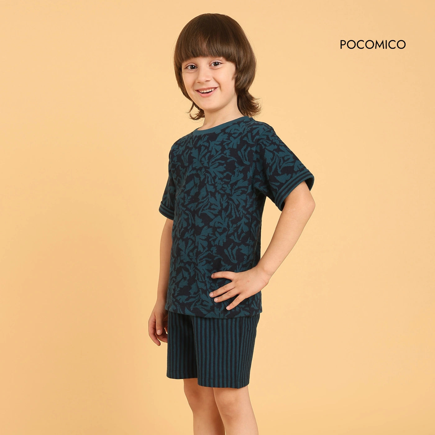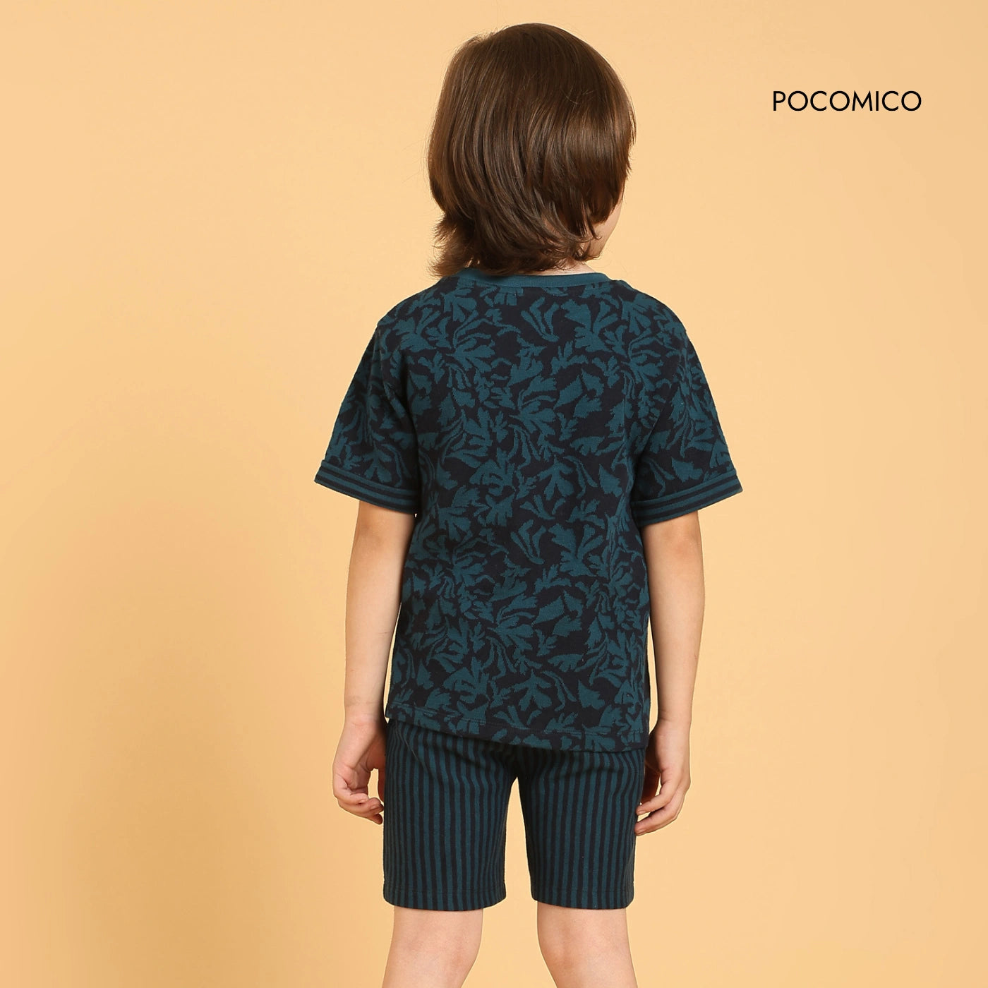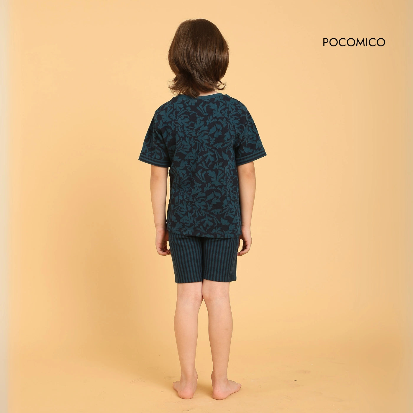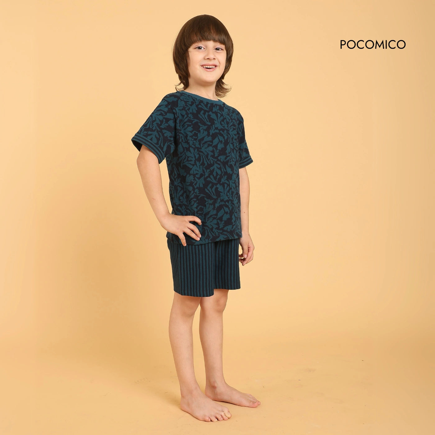 A perfect balance of style and comfort, this All Blue Explorer Set is a wardrobe must-have. The cotton jersey and ribbed neckline offer breathability and stretch, making it perfect for active days. The dark, subtle printed weave tee with striped shorts in contrasting aqua blue and navy blue, adds an understated charm, making it easy to dress up or down. Perfect for fun outings and long hours of play under the sun.